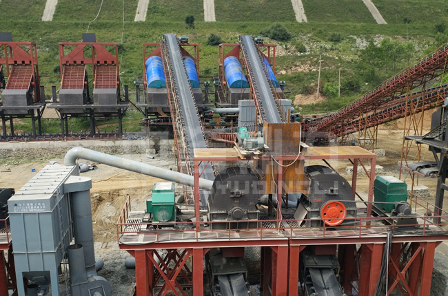方案二:ZGC2560給料機+PCZ2125重錘破+PC1220錘破(2臺)+2YKZ3070振動篩(12臺)+配套設備;