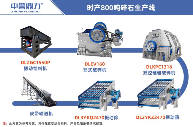 設(shè)備配置方案:DLZGC1550P振動(dòng)給料機(jī)、DLEV160顎式破碎機(jī)、DLKPC1316雙腔硬巖破、DL2YKZ2470振動(dòng)篩、3YKQ2470振動(dòng)篩、輸送機(jī)。