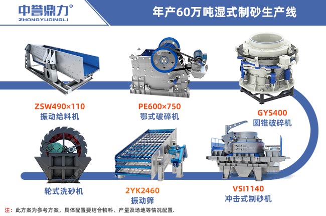 設備配置:ZSW490×110振動給料機、PE600×750顎式破碎機、GYS400圓錐破碎機、VSI1140制砂機、2YK2460振動篩、XS3020洗砂機、輸送機若干。