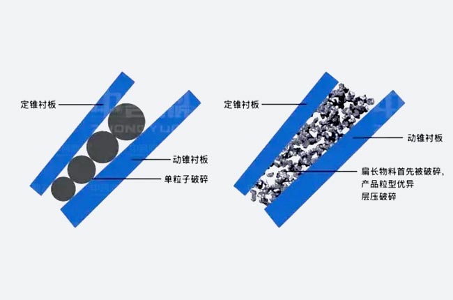 粒間層壓破碎,合理利用物料間的相互擠壓,在提升破碎效率、成品比例的同時,較大程度上減少了傳統(tǒng)圓錐破針片狀含量大的問題,實(shí)現(xiàn)破碎粒度均勻、粒形、級配更合理。
