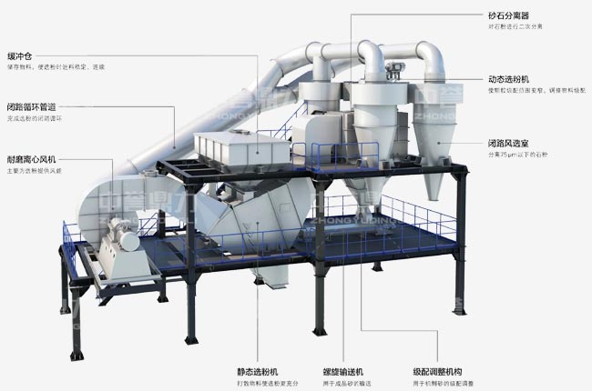 1、物料分散技術讓機制砂和石粉分離,干式選粉,物料干燥、潔凈。