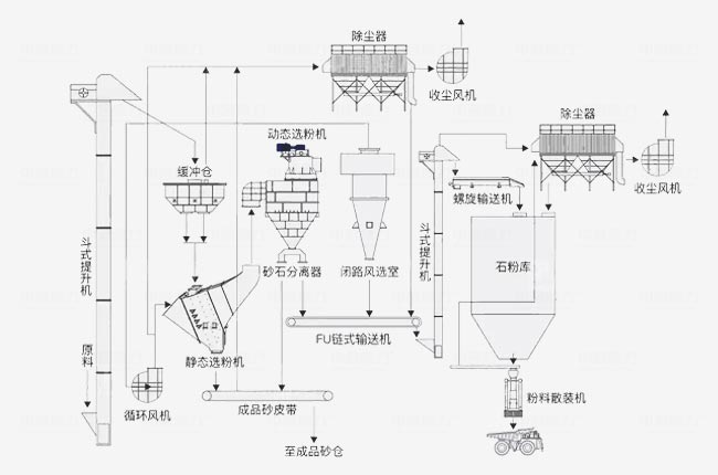 閉路循環風選:負壓運行,風道管路閉路循環,粉塵無外溢,閉路風選室分離75μm以下石粉