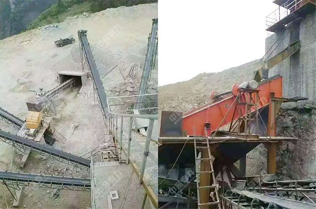 該產線依山而建,利用山體的坡度,將原料直接送進主破碎機內進行粗碎,粗碎后的物料經過篩分后,再進入二破設備內進行整形中細碎,生產出來的物料經過篩選分級后輸送至相對應的成品料堆。