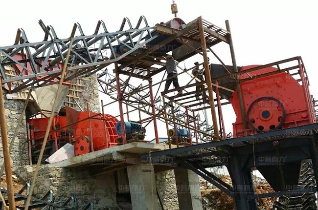 石灰石原料通過給料機均勻?qū)⒃哆M(jìn)PCZ1615重型錘式破碎機中,破碎后的石料會經(jīng)過振動篩篩選,篩分出成本規(guī)格的石料,會有一部分回料,回料會返回PCX1213整形破中進(jìn)行再次破碎,然后再次通過振動篩篩選分級。