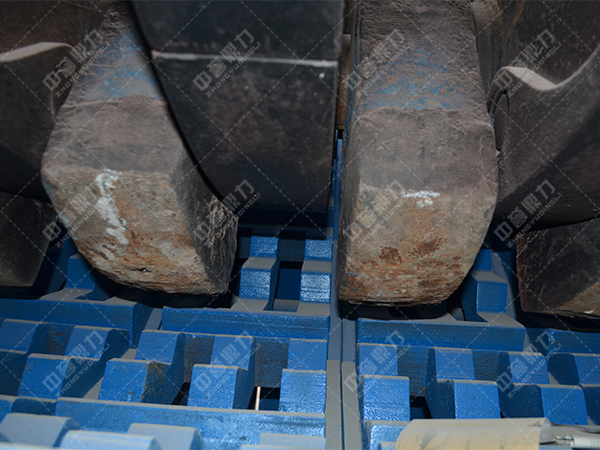 前后兩塊錘頭轉過的時間間隔僅為幾之一秒。在這樣短的時間里,只有少數物料能整塊進入打擊區,而大部分物料,尤其是大塊物料,只有一端進入打擊區,因而錘頭不是打在物料塊的上,即錘頭未與整個物料塊正面沖擊破碎,而是進行斜碰撞。
