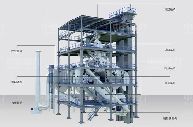 制砂樓(塔樓式制砂樓)采用干式制砂工藝,通過鋼結構疊放設計,將制砂、篩分、選粉等系統(tǒng)集中于立體空間內,具有占地較小、綠色環(huán)保、級配可控、智能操縱等優(yōu)勢。