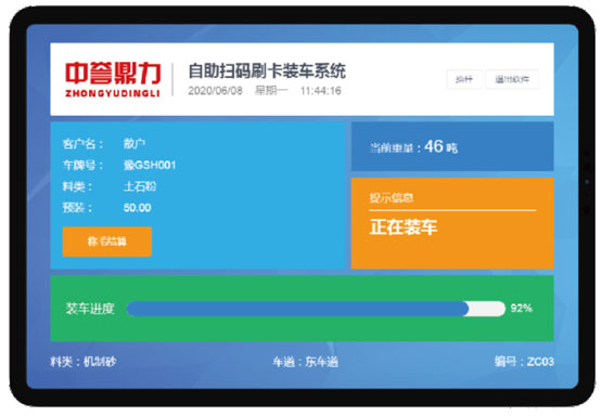 2、司機通過刷卡,砂石料裝車系統進行識別車牌和所在區域物料類型,認證成功后,系統自動開啟裝車開關,待裝載重量到達預裝重量后,系統自動斷電,關停送料口不在裝料。